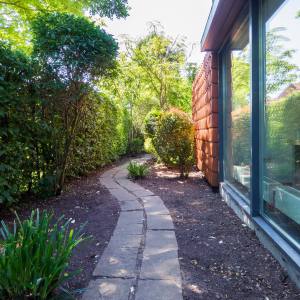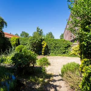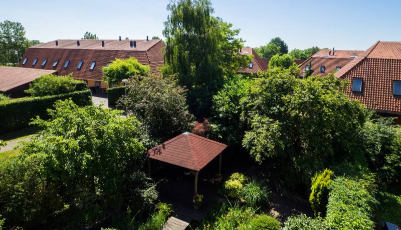 De tuin is fraai aangelegd en bestaat uit veel groen. Achterin de tuin ligt een leuk prieeltje met een vijver. De tuin is ook vanuit de straatzijde middels een poort te bereiken. Een brede haag zorgt voor veel privacy in huis en in de tuin.