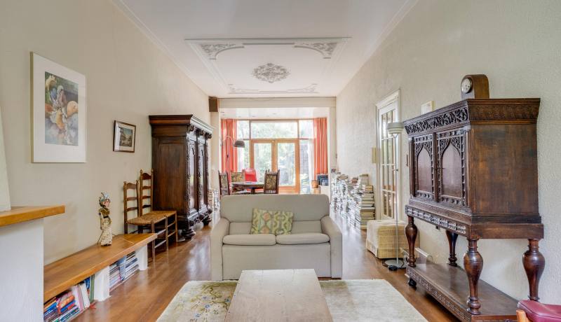 Entree, brede hal (ruim 2 meter) met hoge plafonds (3,2 meter) met gemoderniseerde meterkast, mooie originele wandornamenten, toilet met fonteintje. Ruime uitgebouwde woonkamer van ca. 13 meter diep. Dichte keuken welke na enige bouwkundige aanpassingen bij de woonkamer te betrekken valt zodat je een mooie open woonkeuken creëert van ca. 6,1 meter breed over de volle breedte van de woning. Een keuken aan de voorkant met een grote tuingerichte woonkamer aan de achterzijde behoort ook tot de mogelijkheden. Achter de keuken treft u de bijkeuken aan en daarachter de berging. De uitbouw heeft plaatsgevonden in de jaren tachtig.