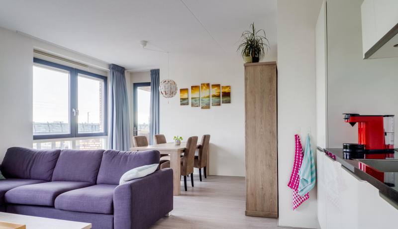 De woonkamer met open keuken ligt aan de voorzijde en heeft bijzonder veel lichtinval. Er zijn grote raampartijen en ligt aan de zuidkant. Je hebt geen bebouwing of andere appartementen tegenover liggen dus vrij zicht. In de woonkamer ligt een neutrale laminaatvloer en de wanden zijn netjes afgewerkt. Er is een moderne en strakke keuken met alle denkbare inbouwapparatuur zoals o.a. een vaatwasser, inductie kookplaat en koel/vriescombinatie. Vanuit de woonkamer heb je toegang tot het balkon welke gelegen is op het zuiden. Vanaf de ochtend tot laat in de avond zit je hier heerlijk in de zon.