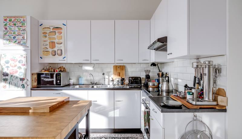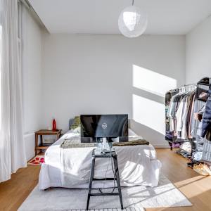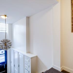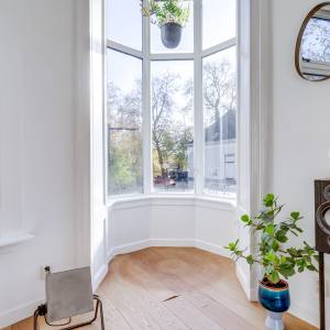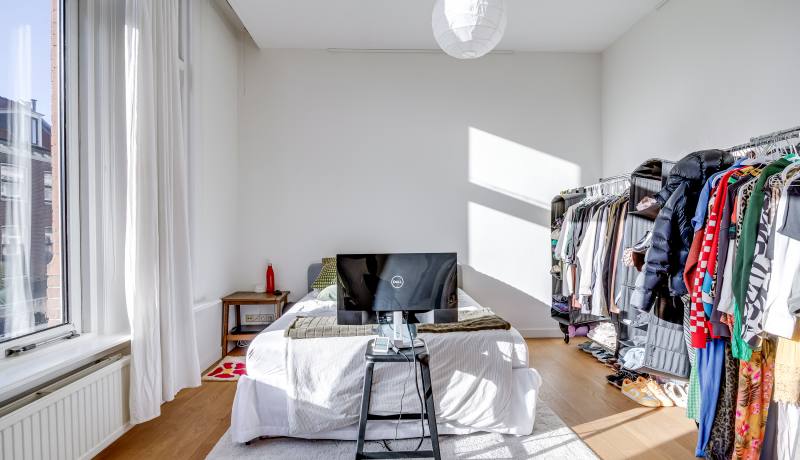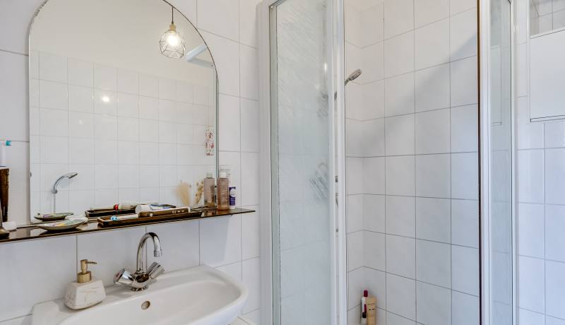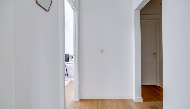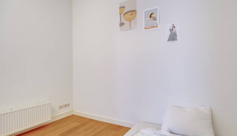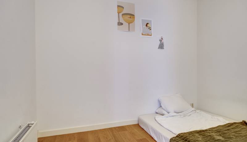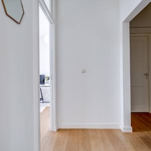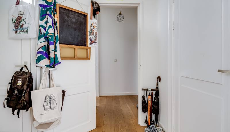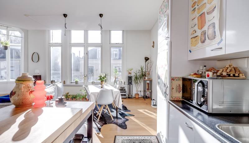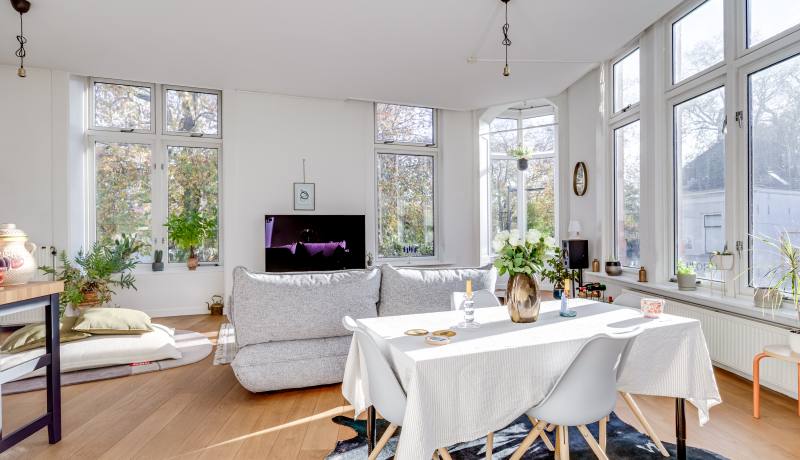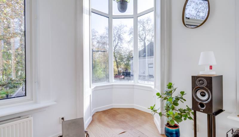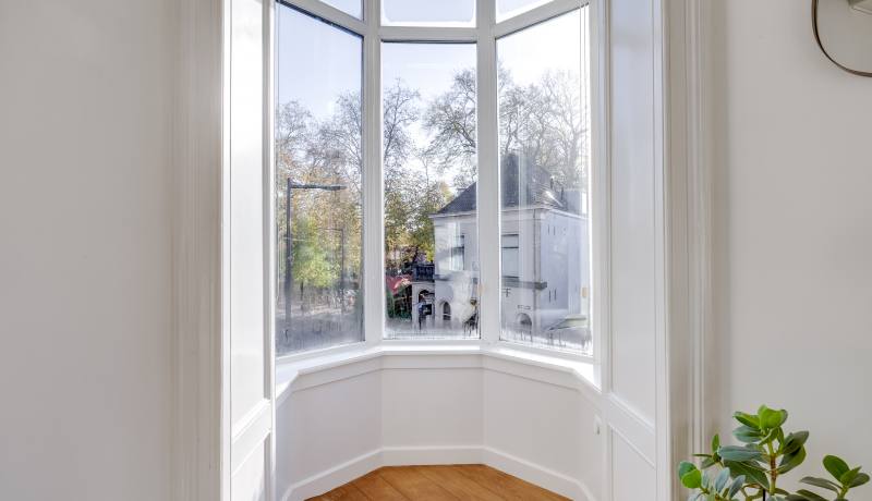 Via the shared entrance you reach the apartment. You enter through a spacious hallway, providing access to all rooms. On the left-hand side you’ll find the generous living room with open kitchen: a wonderful, bright living space with large windows and a charming bay window, allowing daylight to flood in and offering a beautiful view towards the canal and surrounding greenery. The living room provides ample space for a comfortable seating area as well as a large dining table.