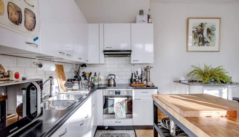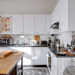 The open kitchen is practical and well laid out, equipped with various built-in appliances — making cooking and entertaining a seamless experience.