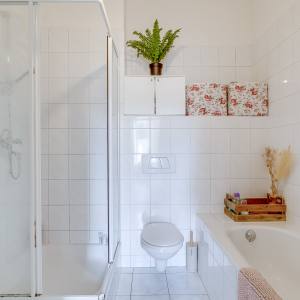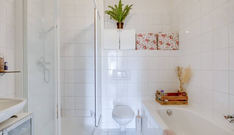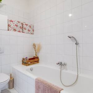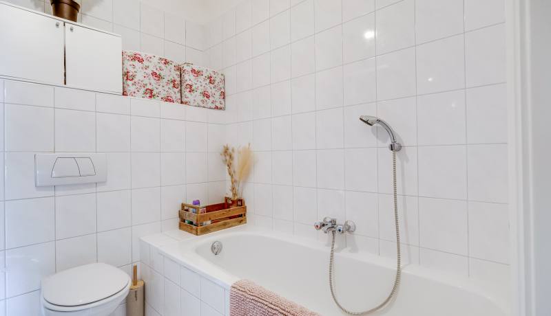 On the right-hand side of the apartment there are two well-sized bedrooms, quietly located and suitable for use as a bedroom, home office or guest room. This part of the apartment also includes a separate internal storage/laundry space with connections for a washing machine and additional storage. The bathroom is fitted with a bathtub, shower, washbasin and toilet. In the hallway there is also a separate guest toilet. The layout is practical, comfortable and ideal for everyday living.