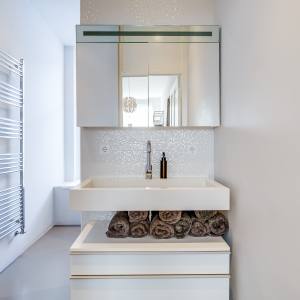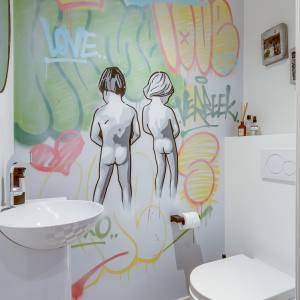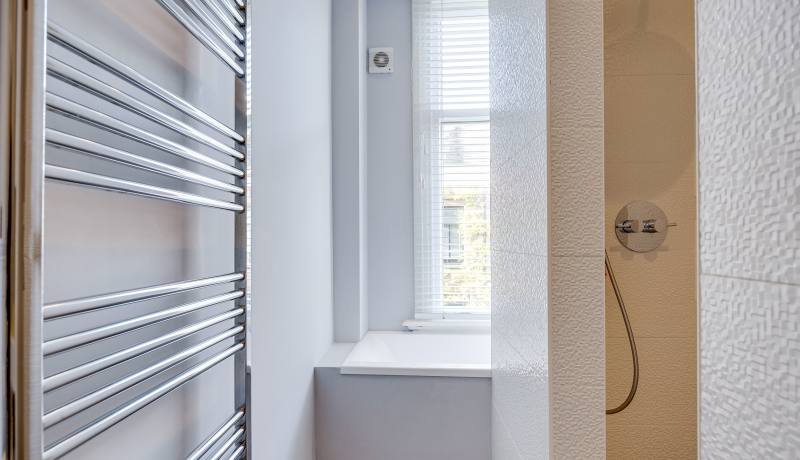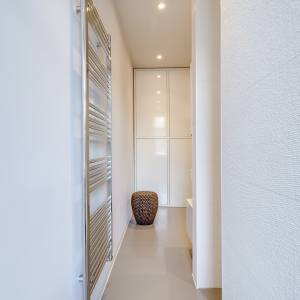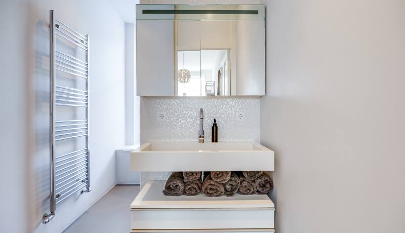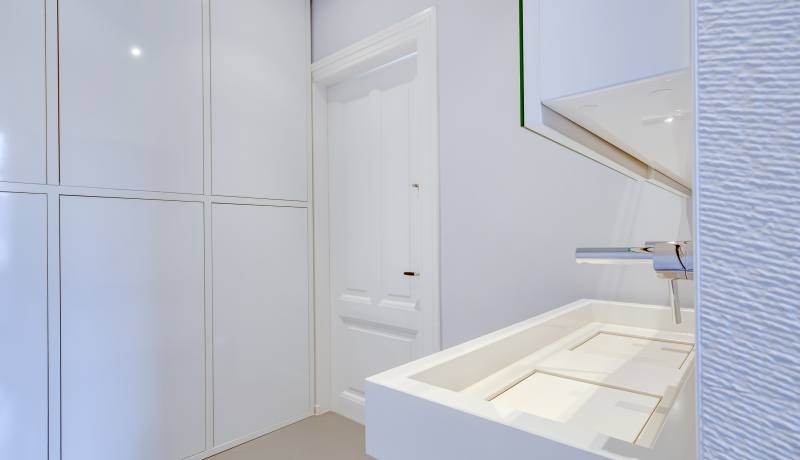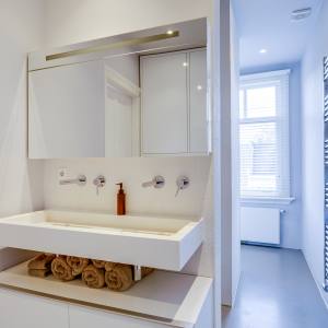 The second floor also offers two large bedrooms, both with practical built-in wardrobes. You will also find the second bathroom here, complete with double washbasin, shower, and toilet. This makes the floor ideal for families, guests, au pairs, or working from home.