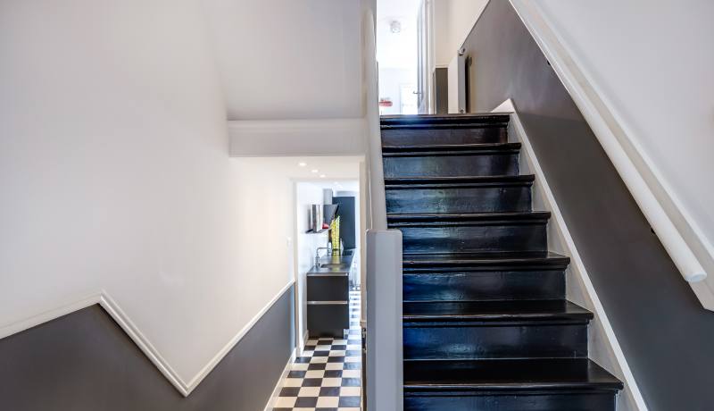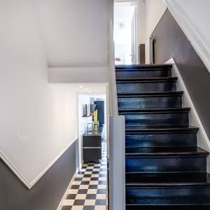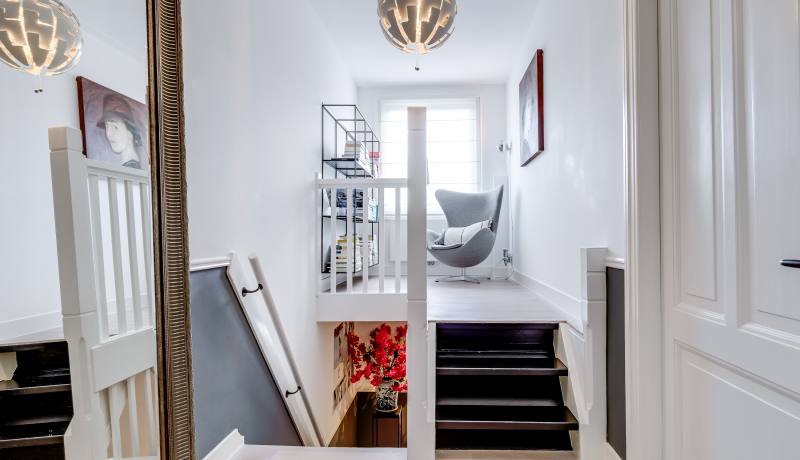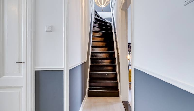 You enter the spacious and stately hallway, a beautiful first impression with plenty of light and room. At the front is the living room, a charming and bright space perfect as a sitting area or lounge. At the rear, you’ll find the dining room with the adjoining kitchen. Thanks to the length of the floor, the high ceilings, and the large windows, this level feels spacious and elegant. From both the dining room and the kitchen, you have direct access to the back garden, making this a perfect spot for long dinners, children playing, or cozy gatherings. A separate toilet and the staircase are also located on this floor.