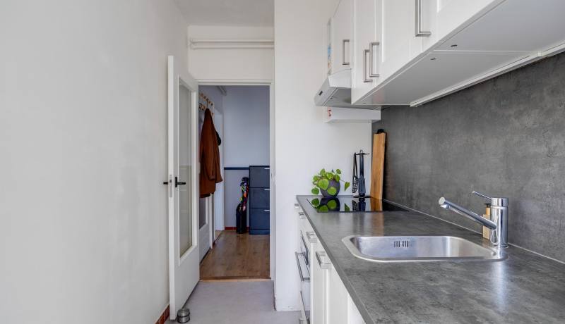 The apartment is located on the second floor where you enter a spacious hall with built-in / meter cupboard through the entrance. Almost all rooms open onto the hall, including two bedrooms, a toilet, the living and dining room and the kitchen. The kitchen is located at the front of the apartment, and was completely renovated in 2018 and equipped with a dishwasher, combi oven / microwave, induction hob, washing machine connection and plenty of cupboard space. In the corner is a separate fridge-freezer combination (possibly for sale). From the kitchen you also have access to the balcony at the front. It is located on the northeast, so you can drink a cup of coffee in the sun in the morning.