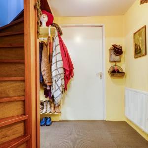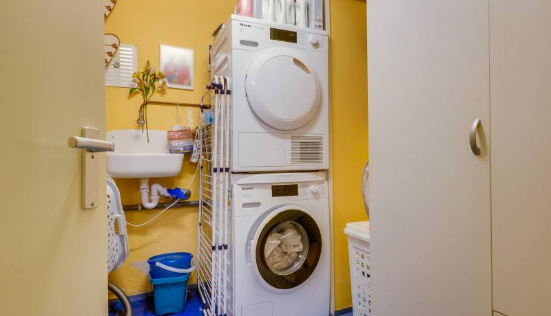 Driveway with space for one car, garage with electric door. In addition to storage space, this space is also very suitable for a practice or home business, for example by installing a window. Adjacent is a separate room for the washing machine and dryer. The first floor is reached via the hall and staircase.