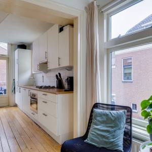 1e verdieping: woonkamer met originele schouw en vaste kast, open moderne keuken met toegang via openslaande deuren, tot het dakterras. De keuken is voorzien van een koelkast, vriezer, quooker, vaatwasser, combi oven, rvs afzuigkap en een 4 pits gaskookplaat.