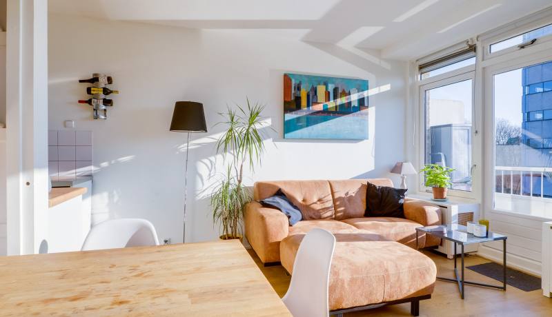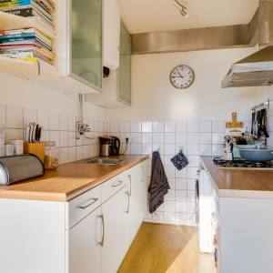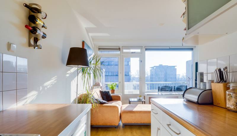 Via de gezamenlijke entree kom je met de lift of met de trap op de galerij op de 5e verdieping. Hier vind je de toegang van het appartement. Via de eigen voordeur loop je rechtdoor de lichte en ruime woonkamer in. Vanuit de woonkamer heb je toegang tot het ruime balkon gelegen op het Zuid Oosten. Het balkon ligt over de hele breedte van het appartement waardoor je genoeg ruimte hebt. De open keuken is gelegen achterin de woonkamer en is voorzien van diverse inbouwapparatuur.