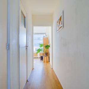 Vanuit de gang is er toegang tot de badkamer voorzien van douche en toilet. Aan de voorkant van het appartement, naast de voordeur, ligt de slaapkamer. De slaapkamer is voorzien van wastafelmeubel met fonteintje. Het hele appartement heeft een mooie laminaatvloer.