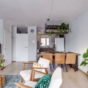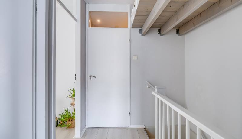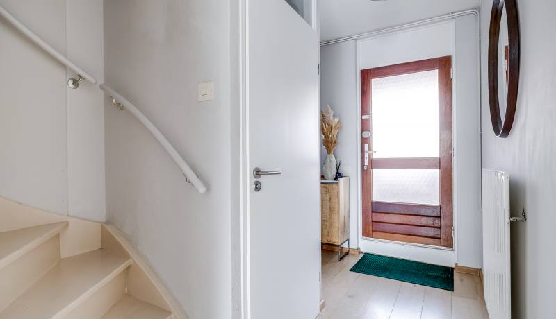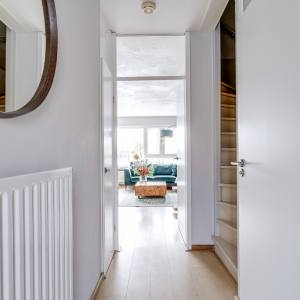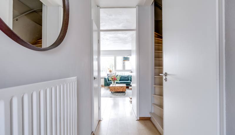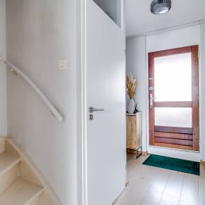 Via the shared entrance you reach the apartment. You enter on the first floor, where the living area is located. From the hallway you have access to the toilet, the staircase and the various rooms. The living room is spacious and wonderfully bright, offering ample space for both a comfortable seating area and a cosy dining area. Adjacent to the living room is a convenient internal storage/closet space, ideal for extra storage, pantry items or household supplies. The kitchen is practically arranged, equipped with various built-in appliances and is openly connected to the living area, creating a pleasant and open atmosphere.