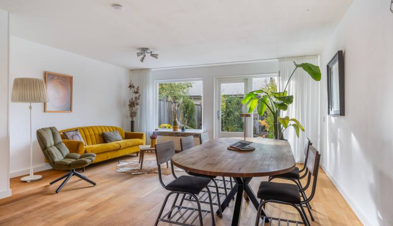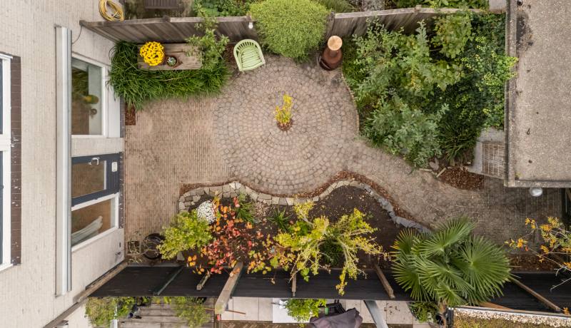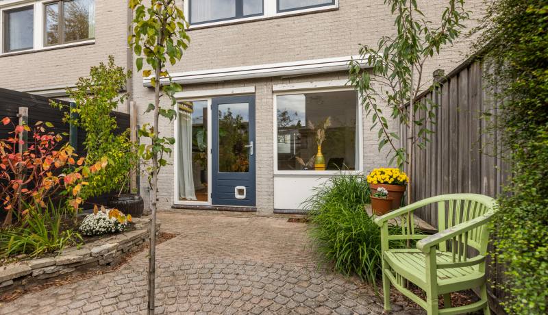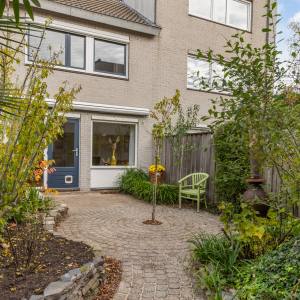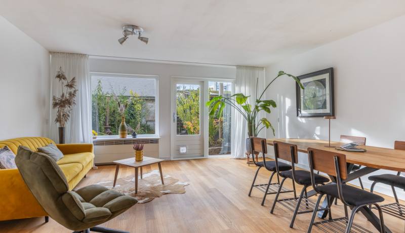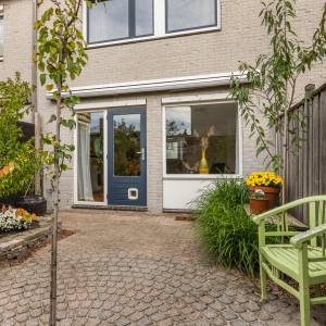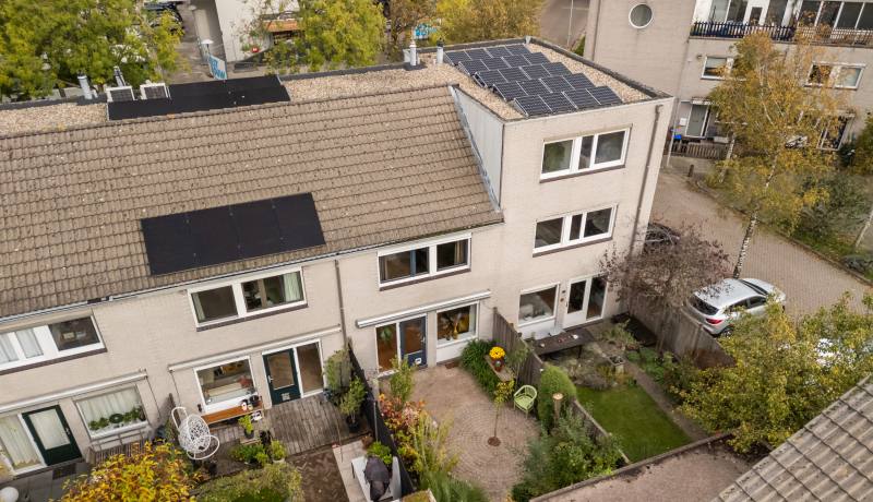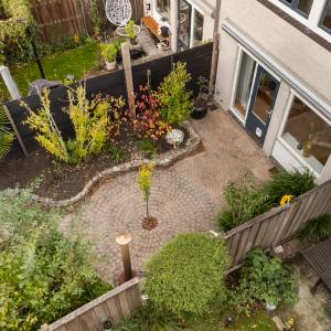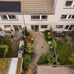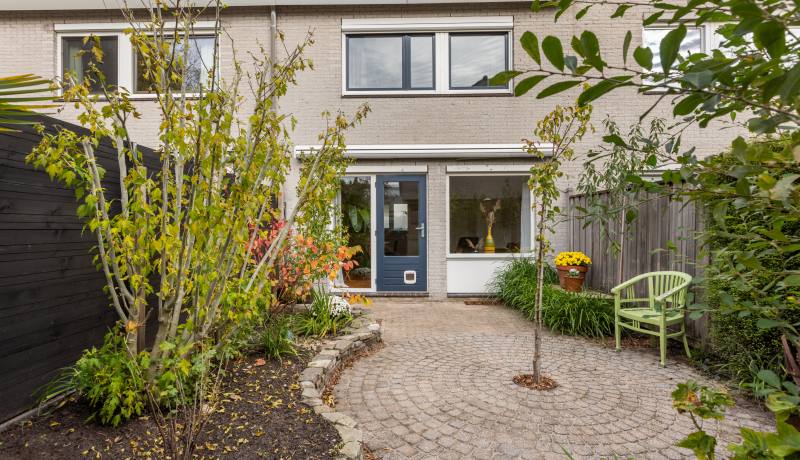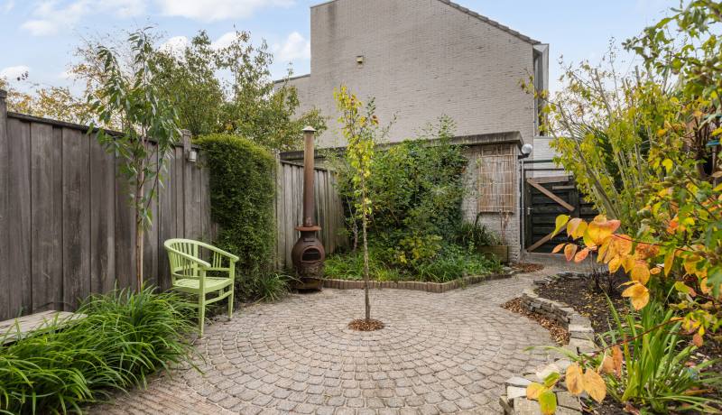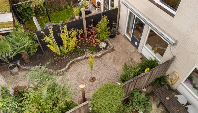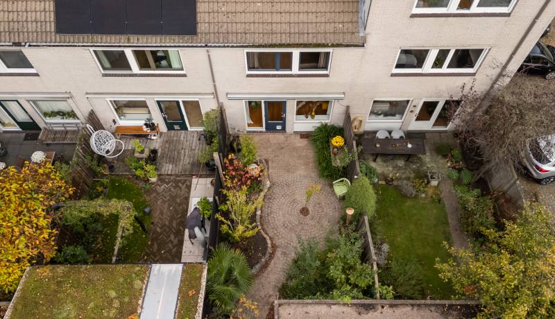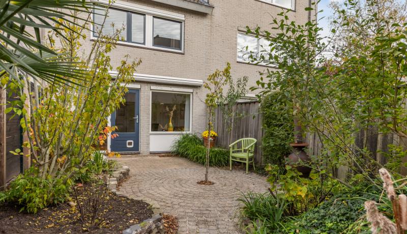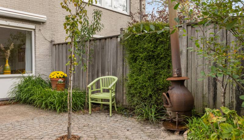 De diepe achtertuin op het zuiden is een van de grote pluspunten van deze woning. Je geniet er van de zon van de vroege ochtend tot de avond, ideaal voor lange zomerdagen, barbecueavonden of een rustig moment met een boek. Achter in de tuin staat een vrijstaande stenen berging en via de achterom kom je er gemakkelijk met de fiets, bakfiets of kinderwagen.