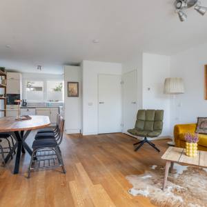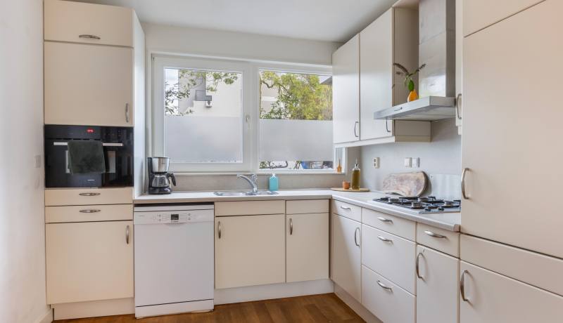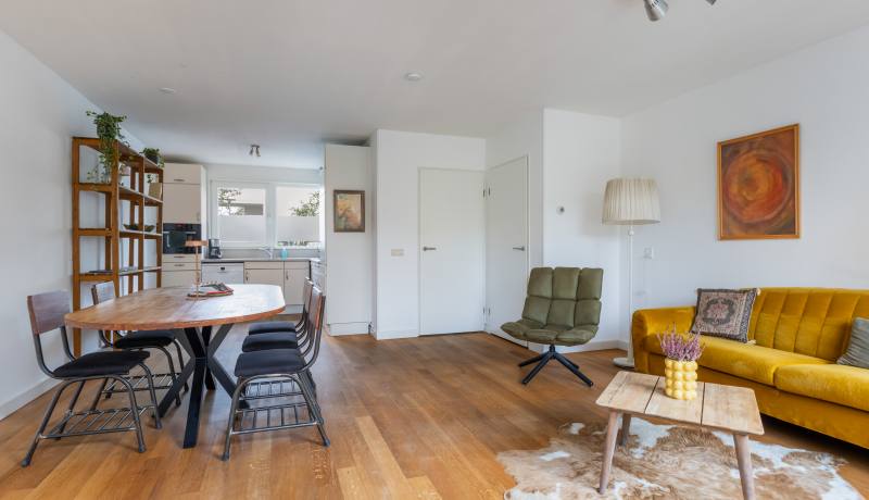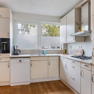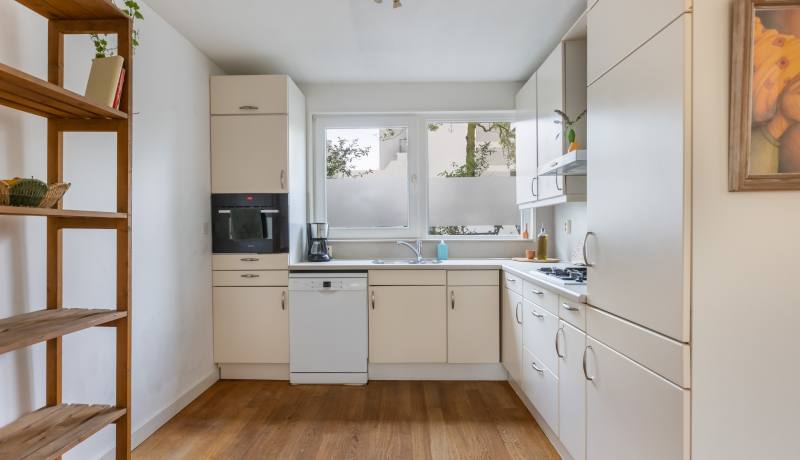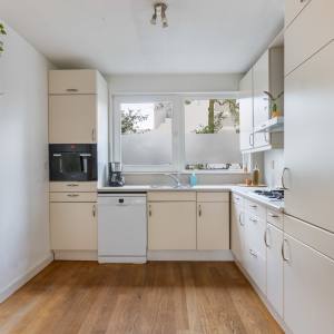 Zodra je binnenstapt, valt het op hoe licht en royaal de woonkamer is. De openslaande deuren naar de tuin maken dit een heerlijke leefruimte voor het hele gezin. De houten parketvloer zorgt voor warmte en karakter. Er is volop ruimte voor een grote eettafel, een gezellige zithoek en een speelhoek. De keuken aan de voorzijde is netjes onderhouden en voorzien van alle basisapparatuur. Wie dat wil, kan hier eenvoudig zijn eigen droomkeuken realiseren.