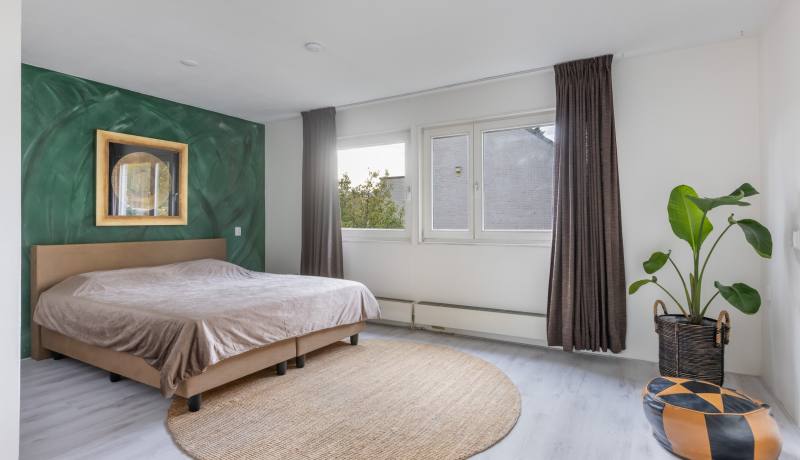 Op de eerste verdieping bevinden zich twee ruime slaapkamers. Op de overloop is een praktische berging met extra opbergruimte. De grote slaapkamer aan de achterzijde was oorspronkelijk opgedeeld in twee kamers en kan eenvoudig weer worden gesplitst. Dit maakt de woning ideaal voor een groeiend gezin of voor wie een extra werk- of logeerkamer wil creëren. De badkamer is verzorgd en voorzien van een douche, tweede toilet en wastafel.