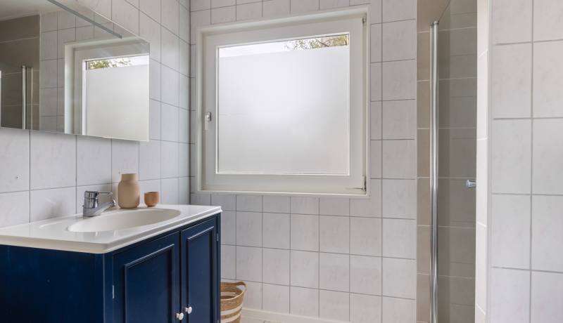 On the first floor are two spacious bedrooms. The landing includes a practical storage area. The large bedroom at the rear was originally divided into two rooms and can easily be split again, ideal for a growing family or anyone who wants an extra study or guest room. The bathroom is neat and equipped with a shower, second toilet, and sink.