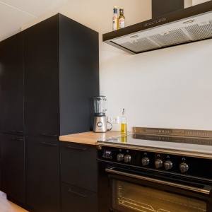 De open keuken ligt aan de voorzijde is strak afgewerkt met zwarte kleurstelling. Er is veel werkruimte en de keuken is voorzien van alle denkbare inbouwapparatuur. Ook vanuit de keuken heb je het vrije uitzicht.