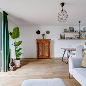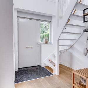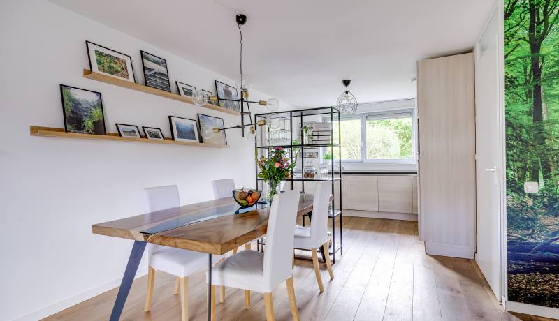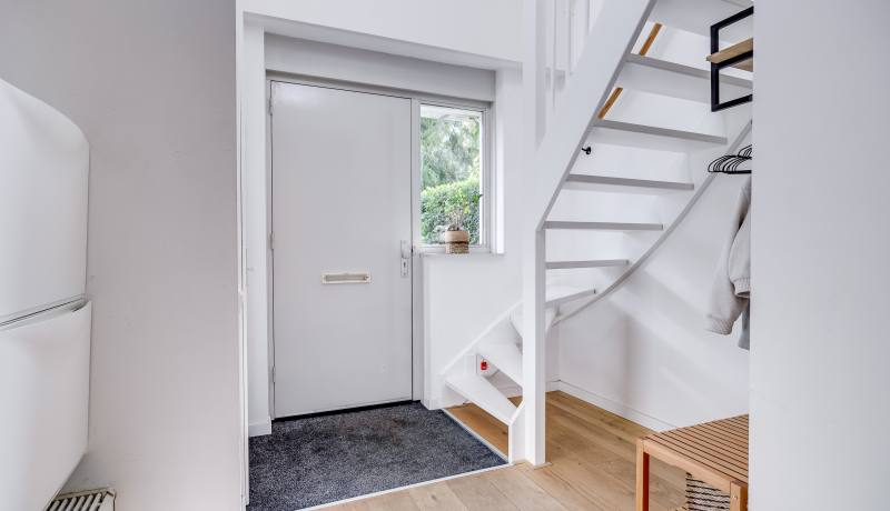 Inside, you’ll find a spacious hallway with access to the modern toilet (renovated in 2020) and the staircase. The living room is bright and airy, featuring a warm parquet floor that continues throughout the house. Thanks to the large windows facing the patio, the space is bathed in natural light. The patio faces southwest and offers a lovely, sheltered spot to sit outside early in the year, even in February, you can enjoy the sun in a T-shirt!