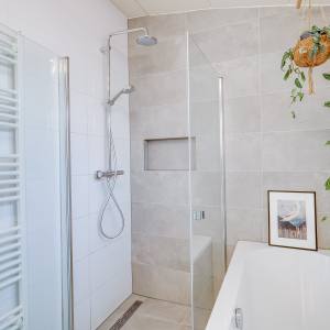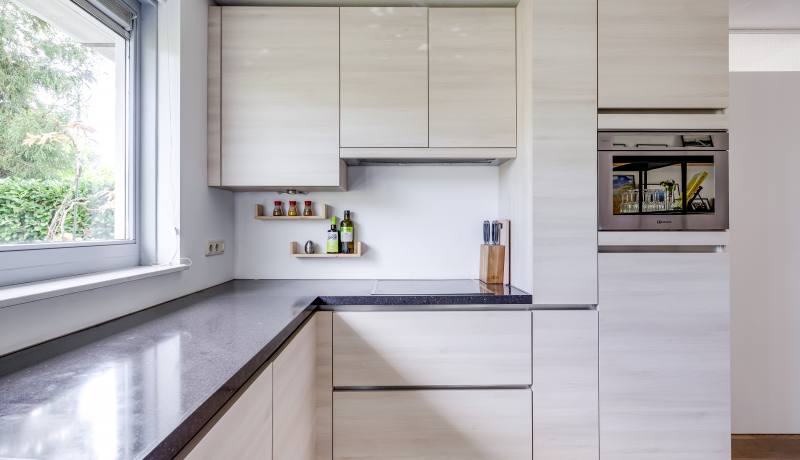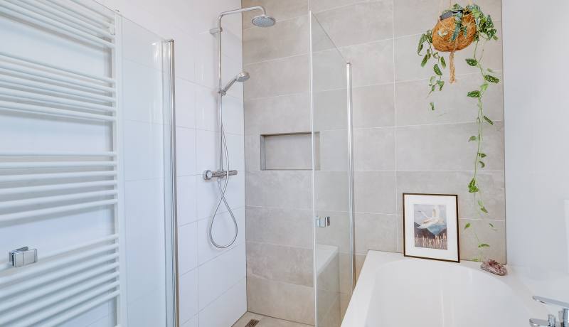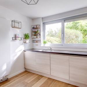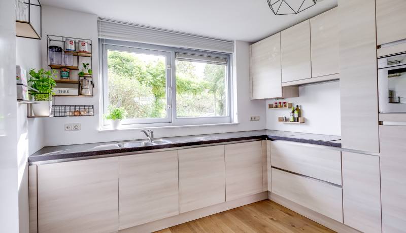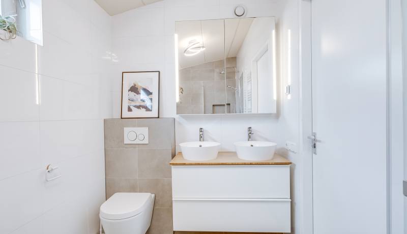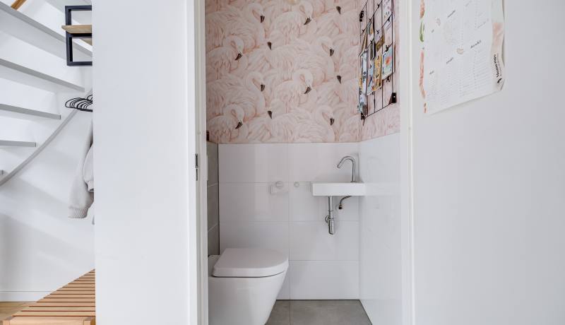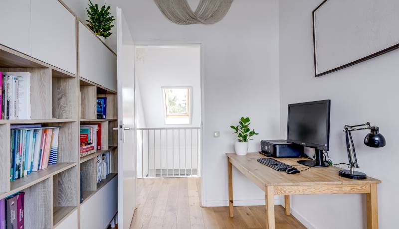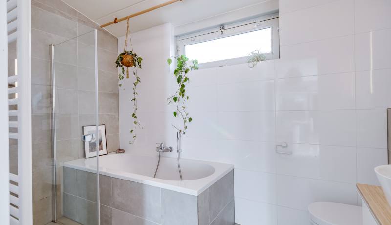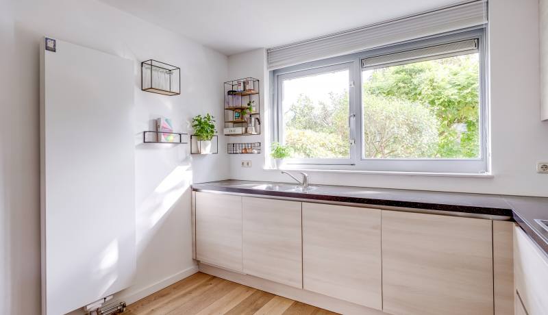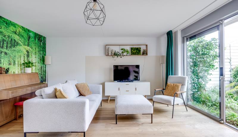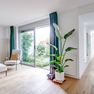 At the front of the house is the open kitchen (installed in 2015), equipped with built-in appliances and a transferable maintenance plan. The ground floor is completely wheelchair-accessible and step-free (except for the bathroom), making the home future-proof and suitable for all ages. The ground-floor bathroom (renovated in 2020) is modern, elegantly finished, and features electric underfloor heating.