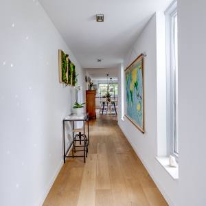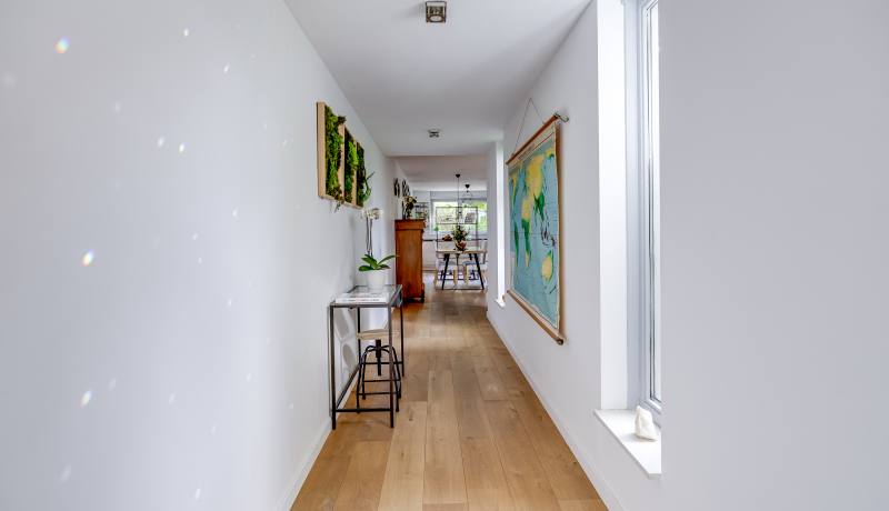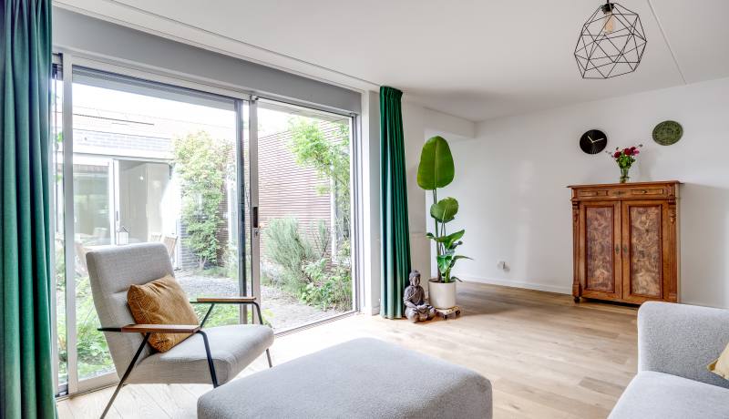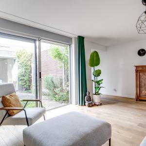 Binnen kom je in een ruime hal met toegang tot het moderne toilet (vernieuwd in 2020) en de trapopgang. De woonkamer is licht en ruim, met een warme parketvloer die door het hele huis doorloopt. Dankzij de grote ramen richting de patio baadt de ruimte in het daglicht. De patio ligt op het zuidwesten en is een heerlijke, beschutte plek waar je al vroeg in het jaar buiten kunt zitten, zelfs in februari met een T-shirt aan!