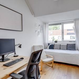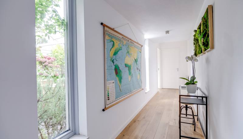 Upstairs, you’ll find several bedrooms, which can easily be combined or divided to suit your needs. This flexibility offers many possibilities, an extra-large bedroom, a guest room, or even a private studio with its own bathroom, ideal for an au pair, (older) children, or visitors. An attic conversion is also possible.