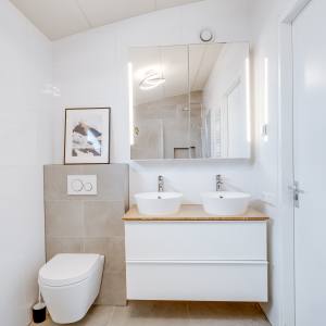 - Eerste verdieping: Overloop, twee slaapkamers (waarvan flexibel indeelbaar), tweede badkamer met toilet, douche en wastafel.