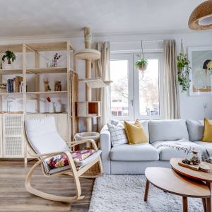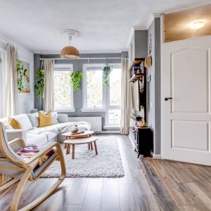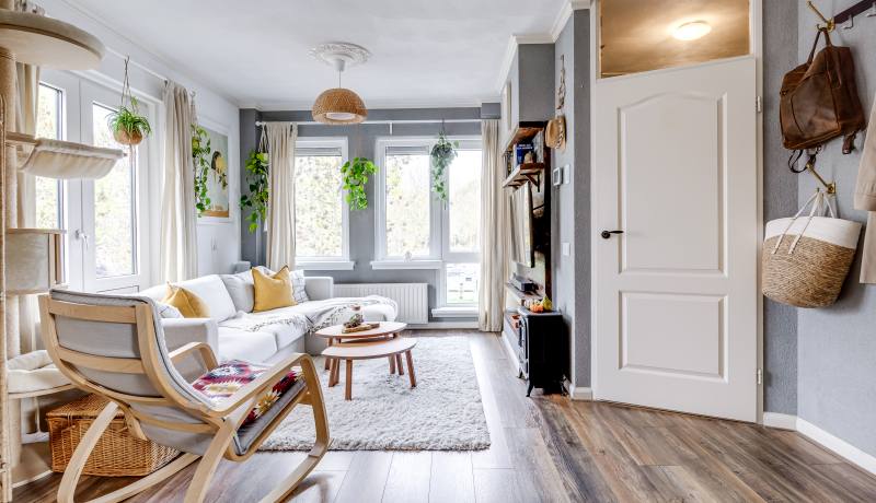 Via the shared entrance, you reach the front door of the apartment, located on the first living level. You enter into a bright hallway with direct access to the modern toilet, completely renovated at the end of 2019. From the hallway you continue into the spacious living room, which feels wonderfully open thanks to the many windows and the through-living layout. The living room offers plenty of space for both a cosy seating area and a comfortable dining space.