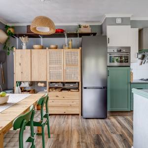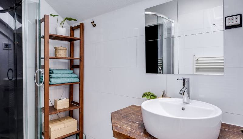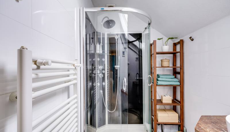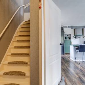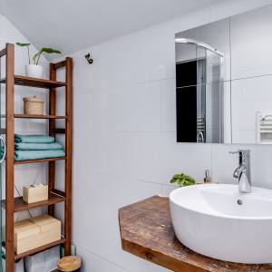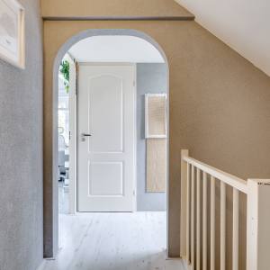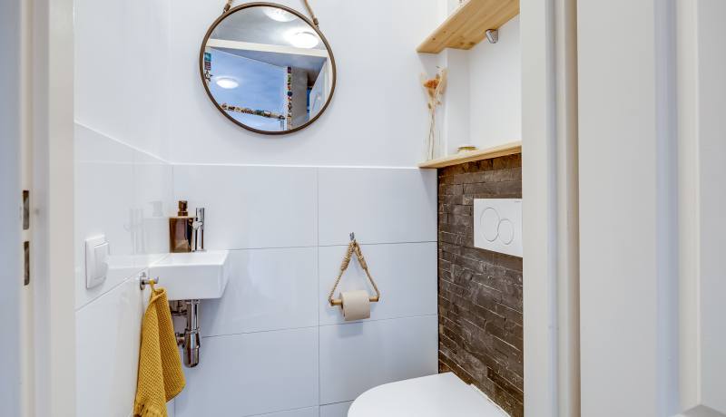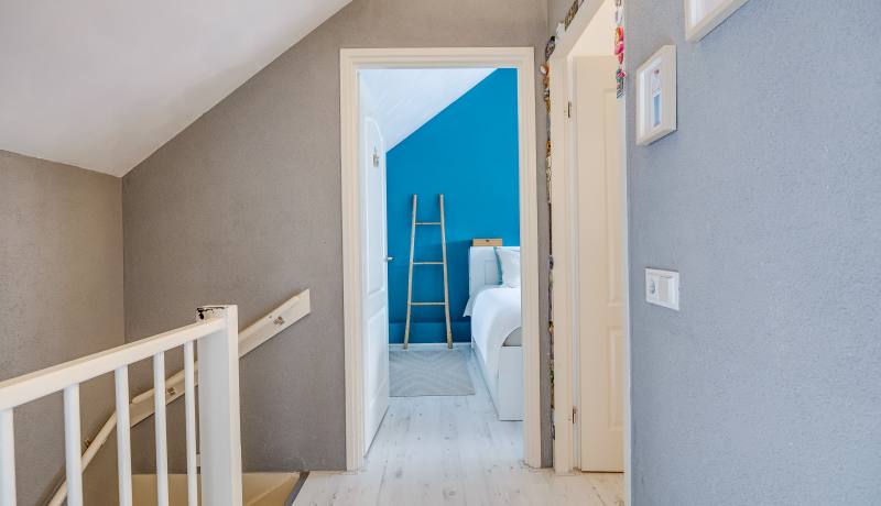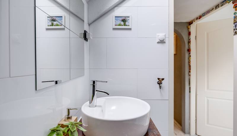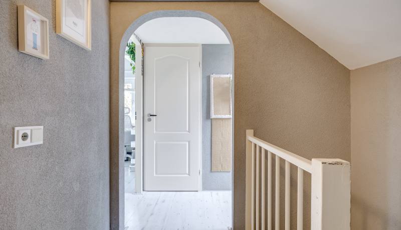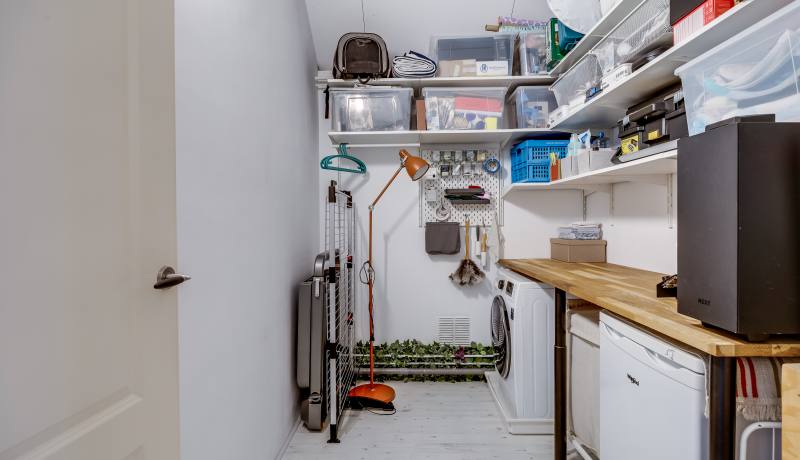 The second floor houses two spacious bedrooms, a separate laundry room that is conveniently organised and very comfortable to use, and a neat bathroom with shower and washbasin. From the landing you also have direct access to the sunny balcony, perfect for enjoying the last rays of the day after work.