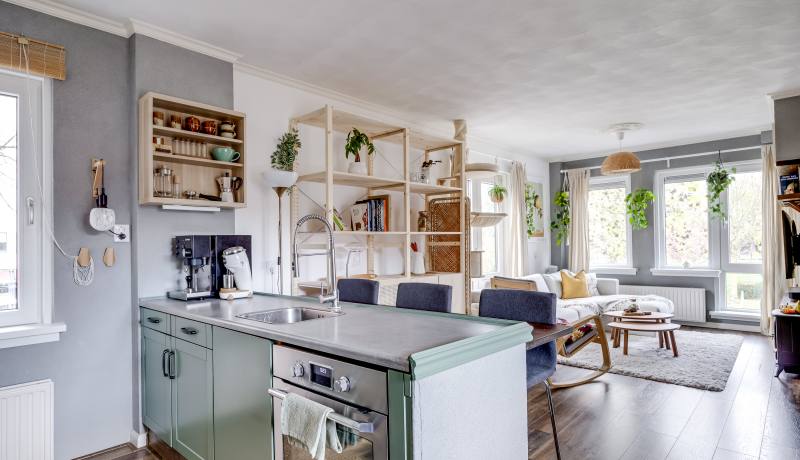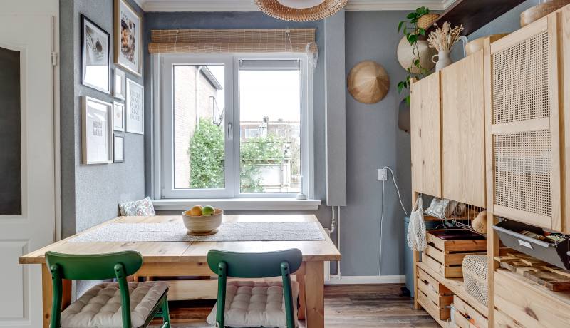 Aan de achterzijde ligt de halfopen keukenruimte, met voldoende mogelijkheden voor een moderne keukenopstelling en veel lichtinval door de grote ramen. Aansluitend bevindt zich de eetkamer, ideaal voor wie graag gasten ontvangt.