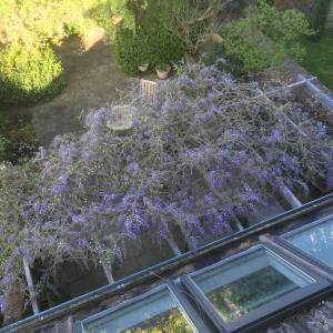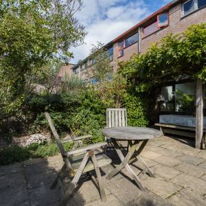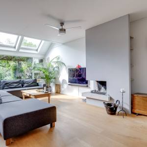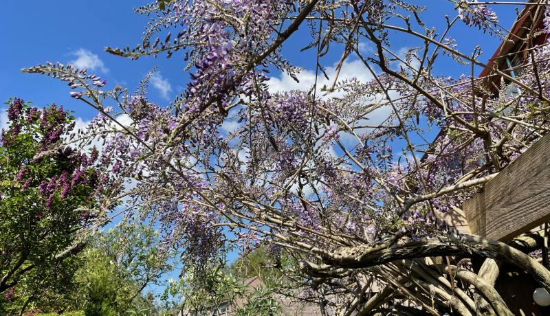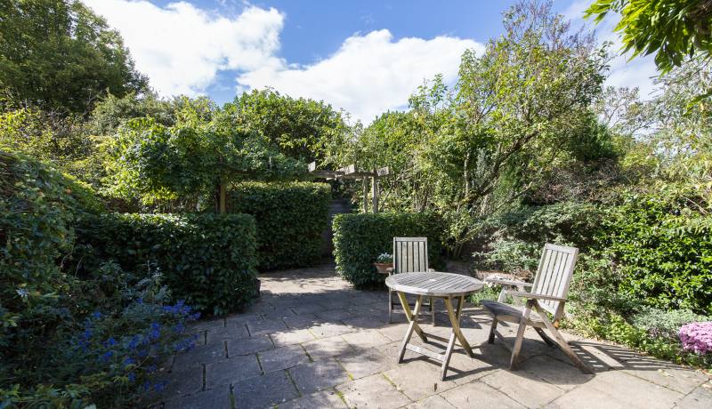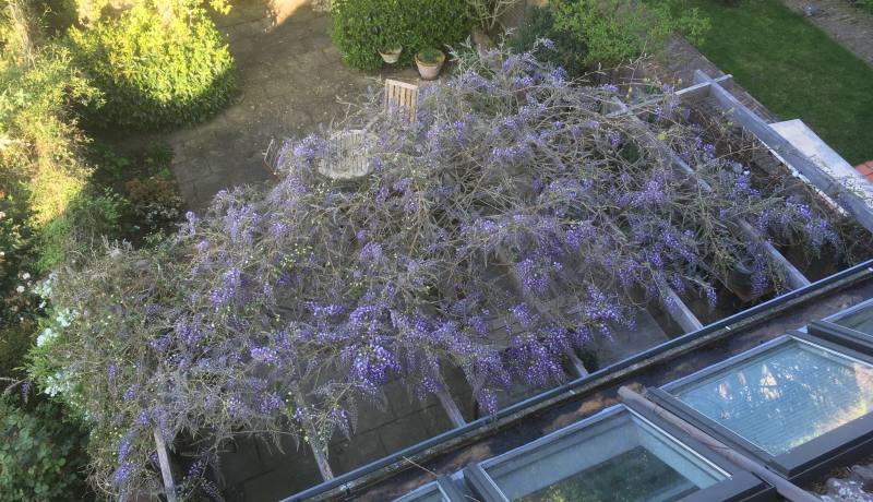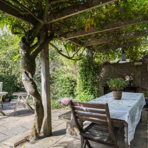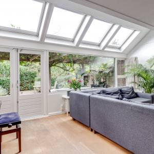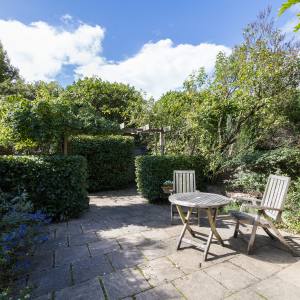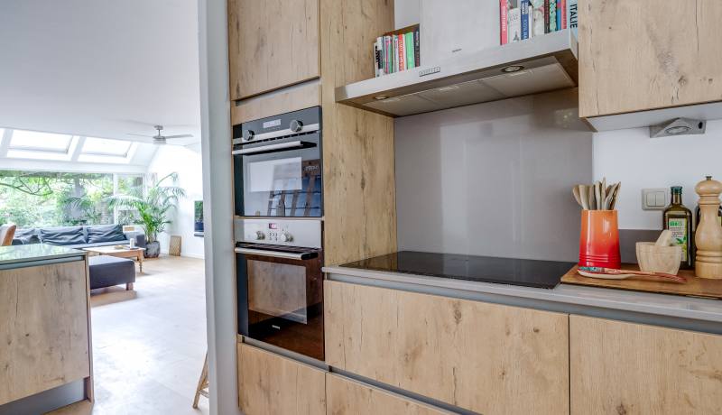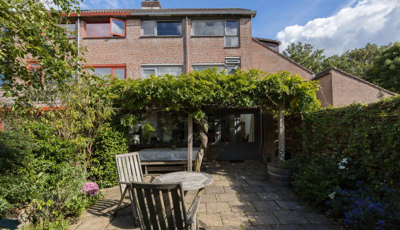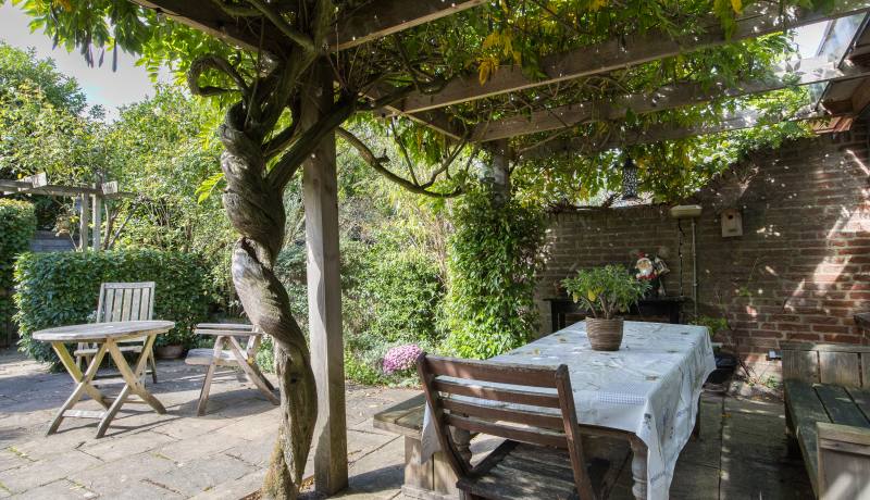 At the front of the house is the modern kitchen (2015), equipped with built-in appliances including a combination microwave, oven, and boiling water tap. The spacious living room is located at the rear, where light floods in through the large windows. French doors open directly onto the lovely southwest-facing garden, which offers plenty of privacy and a smart layout. At the back of the garden, you’ll find a detached storage shed, and in summer, you can relax among roses, lilacs, and a beautiful wisteria climbing over the pergola.