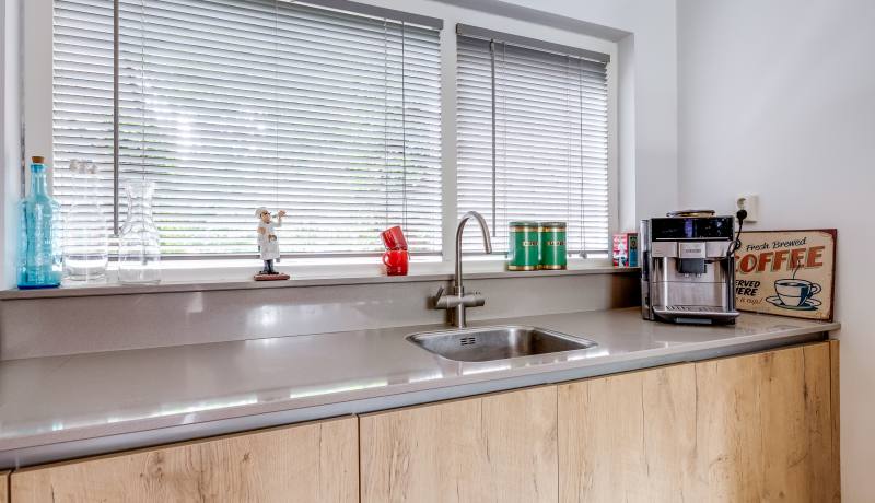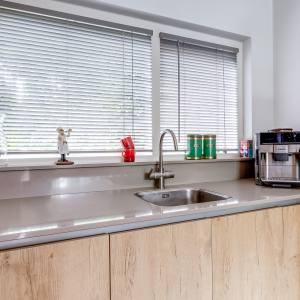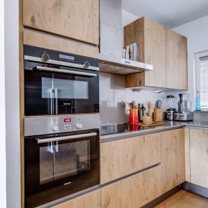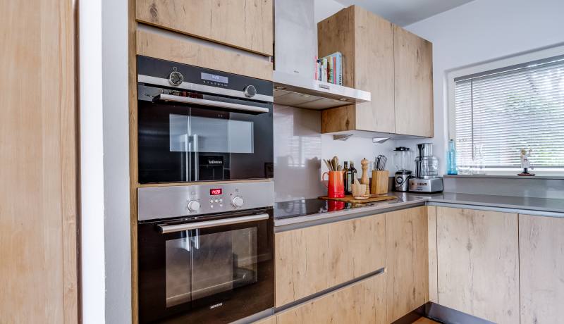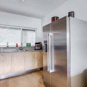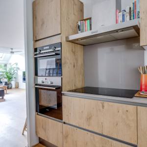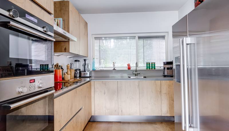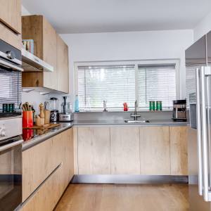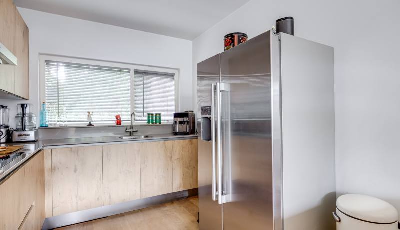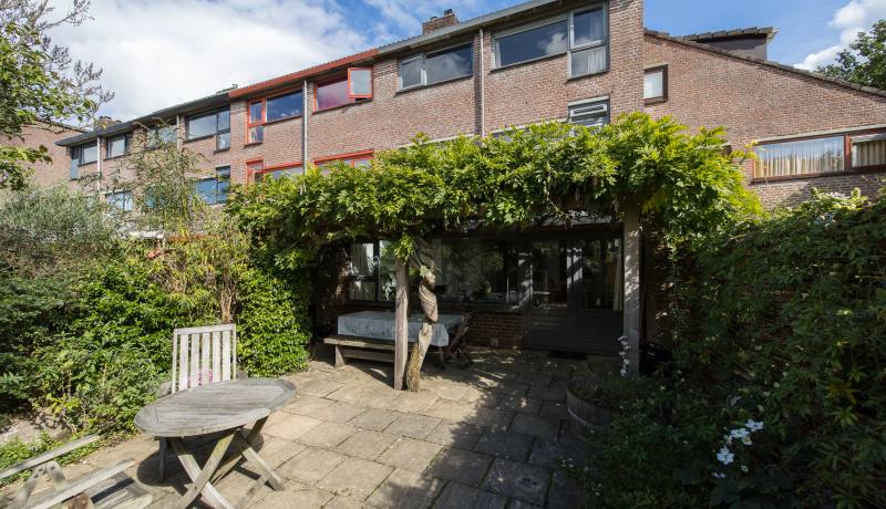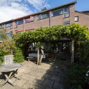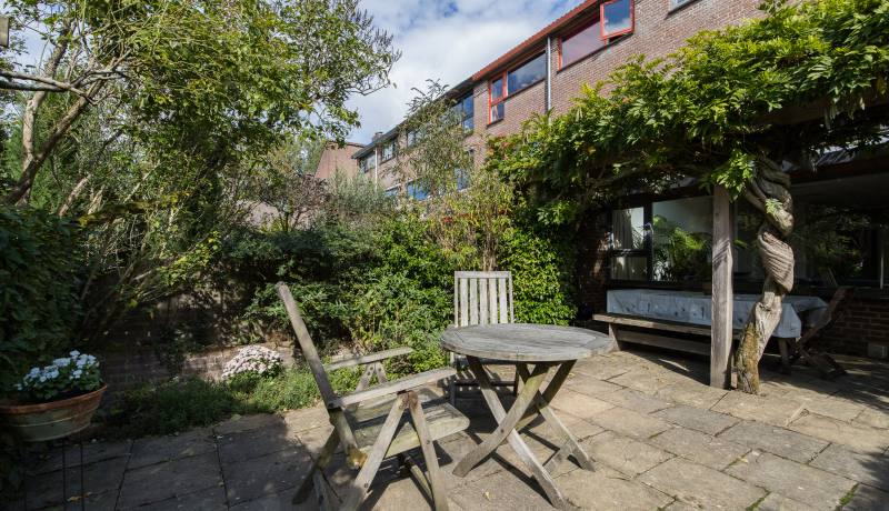 Aan de voorzijde van de woning ligt de keuken. Deze moderne keuken (2015) is voorzien van diverse inbouwapparatuur, waaronder een combimagnetron, oven en een kokendwaterkraan. Aan de achterzijde bevindt zich de royale woonkamer, waar het licht rijkelijk naar binnen valt. Via de openslaande deuren loop je zo de fraaie achtertuin in. De tuin ligt op het zuidwesten en heeft een gunstige indeling, veel privacy en achterin een handige vrijstaande berging. In de zomer geniet je hier van rozen, seringen en onder de pergola van de fraaie blauwe regen.