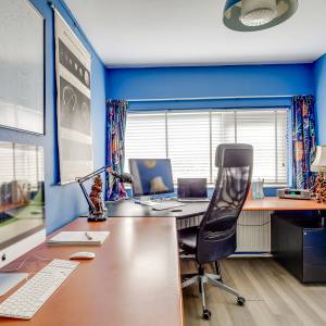 - Begane grond: Voortuin met eigen oprit, inpandige studio/berging met vliering, hal met toilet en trapopgang, keuken aan de voorzijde, ruime woonkamer met openslaande deuren naar de achtertuin, achtertuin met vrijstaande berging