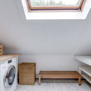 The house has a neat front garden with a private driveway, providing parking on your own property. Upon entering, you step into a spacious hallway with a staircase, a toilet, and access to the living room. At the front of the hall, there’s a studio (formerly the garage) with a large attic accessible by a loft ladder, ideal for hobbies, a gym, or extra storage.